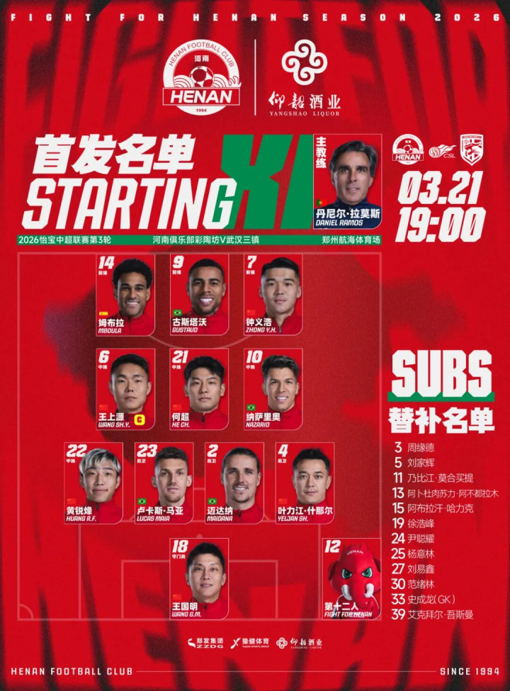 河南俱乐部彩陶坊:18-王国明、2-迈达纳、4-叶力江·什那尔、23-卢卡斯·马亚、6-王上源、10-纳萨里奥、21-何超(46' 13-阿卜杜肉苏力·阿不齐拉木)、22-黄锐烽(86' 19-徐浩峰)、7-钟义浩(73' 25-杨意林)、9-古斯塔沃、14-姆布拉(86' 11-乃比江·莫合买提)武汉三镇:22-方镜淇、2-贺惯、3-亚姆卡姆、15-陈哲超、23-未来、7-绍尔(84' 19-刘奕鸣)、20-阿德里亚诺、21-熊继政(84' 12-廖承坚)、9-郑浩乾(66' 8-汪晋贤)、10-贝维斯(97' 24-姜利勋)、29-卡迪斯