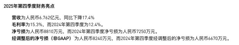 从公司盈利层面来看,小牛仍是一语气四年录得年度耗费,具体到25年第四季度,在国外市集销量承压和新国标换车红利消退后,小牛单季功绩显赫下挫,其中当季营收仅6.76亿元,同比减少17.4%;当季整车销量17.87万台,同比下滑13%,带来季度净耗费8810万元。