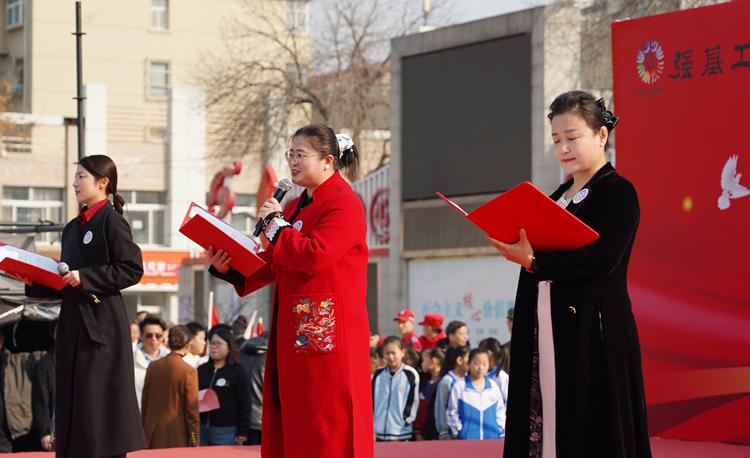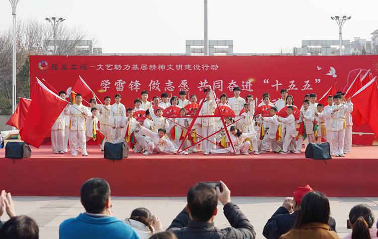 图为在固安县东说念主民广场,演员饰演诗朗读《雷锋精神永不结果的时期之光》。吴迪摄