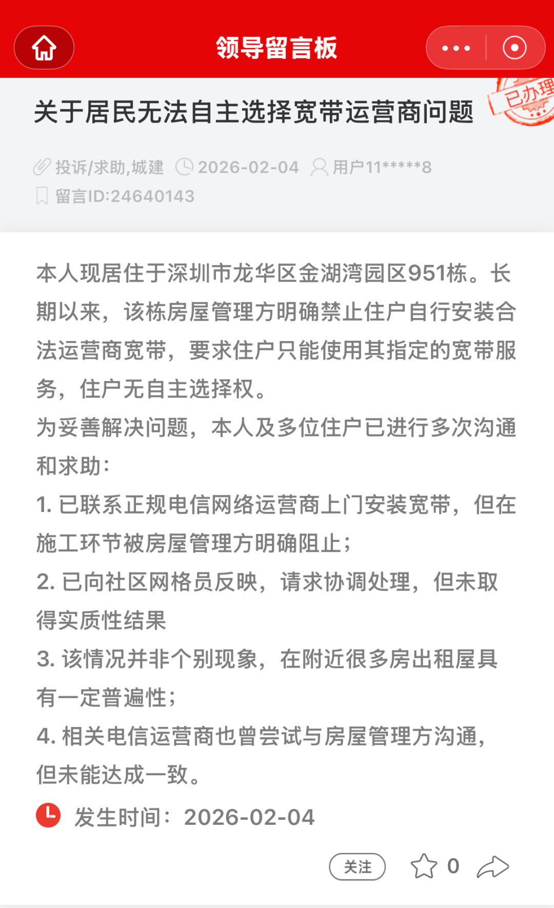 2月4日,有现居住于深圳市龙华区金湖湾园区951栋的市民通过东说念主民网“带领留言板”反应,长期以来,房屋连接方明确辞让居民自行安设正当运营商宽带,要求居民只可使用其指定的宽带做事。