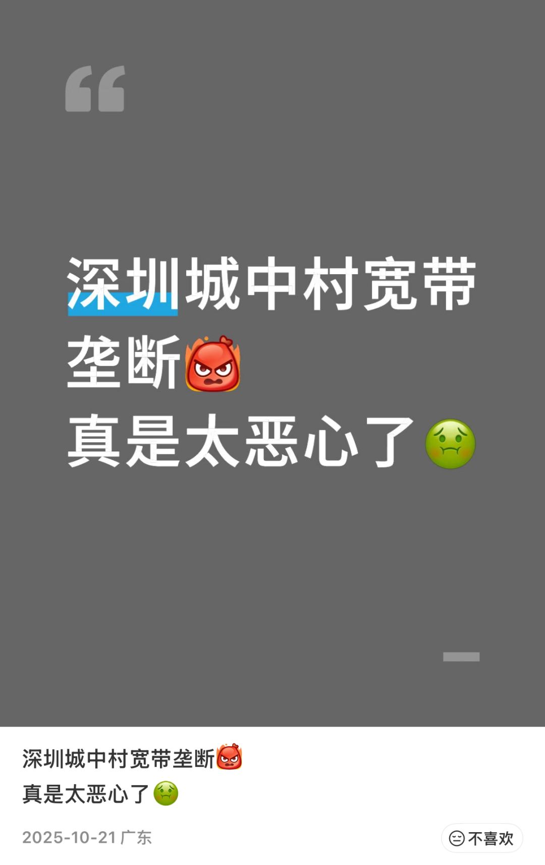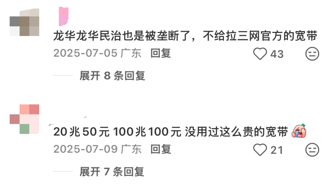 奥一新闻记者梳剪发现,深圳多数城中村均存在通常的“宽带刺客”时局,酬酢平台上联系话题也引起热议。不少租客坦言,房主或房屋连接方要求租客只可办理指定的宽带,不仅资费远超市面范例,汇注做事质料也堪忧,有网友直言“又贵还卡”。“没得选、用得差、维权难”的近况,让不少租客直呼“太恶心”“让东说念主烦扰”,成为深圳城中村租住体验中的一大痛点。