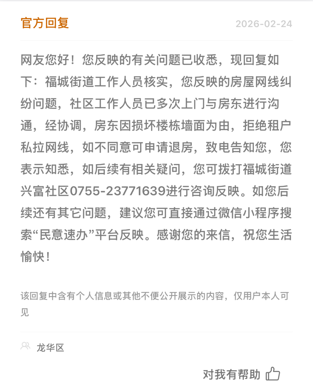 针对该市民反馈的房屋网线纠纷问题,龙华区联系部门于2月24日作出回复。回复中称,福城街说念社区使命主说念主员已屡次上门与房主疏导,房主以损坏楼栋墙面为由,拆开佃农私拉网线,如不同意可苦求退房,市民已表奉告悉。