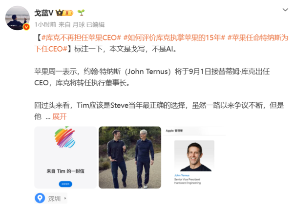 据CNMO了解,苹果昨日晓谕,约翰·特纳斯(JohnTernus)将于9月1日接替蒂姆·库克(TimCook)出任公司CEO,库克将转任扩充董事长。