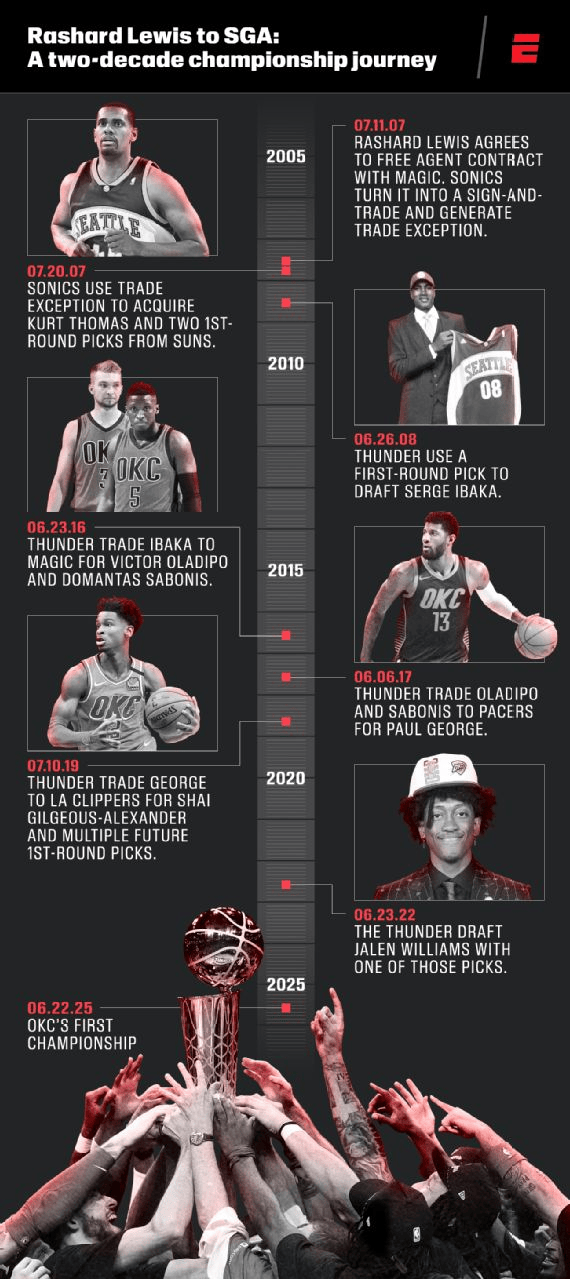 雷霆队的冠军征途可以追思到一个日历——2007年7月11日——和又名球员:前西雅图超音速队前卫拉沙德-刘易斯。