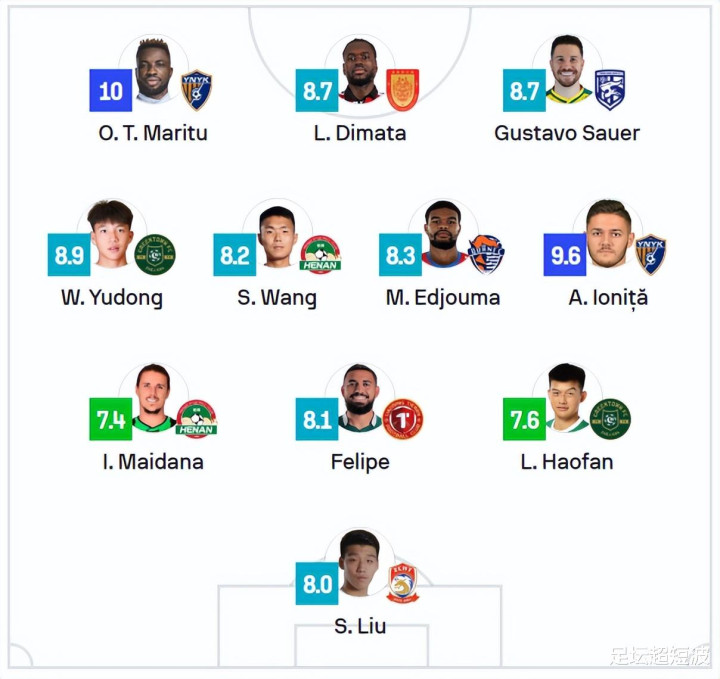 赛后,外媒SOFASCORED凭据全部8场比赛参赛球员的详备时刻统计数据,评出了本轮中超联赛的最好威望。