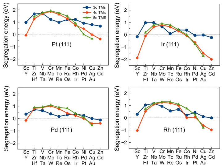 DFT议论曾系统分析了Pt–Ni、Pt–Pd等催化合金中Pt、Pd原子在不同晶面名义的偏析能分散。举例,关于Pt75Ni25合金,表面收尾标明Pt原子向名义偏析不错权臣擢升氧规复反映(ORR)的催化活性,这在Fuel Cell领域具有病笃真谛。